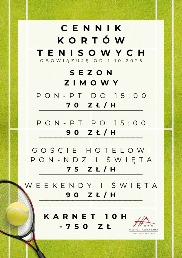 Zapraszamy do skorzystania z naszych doskonale przygotowanych kortów tenisowych w Hotelu Austeria! Niezależnie od pory roku, oferujemy idealne warunki do gry zarówno dla amatorów, jak i doświadczonych zawodników.